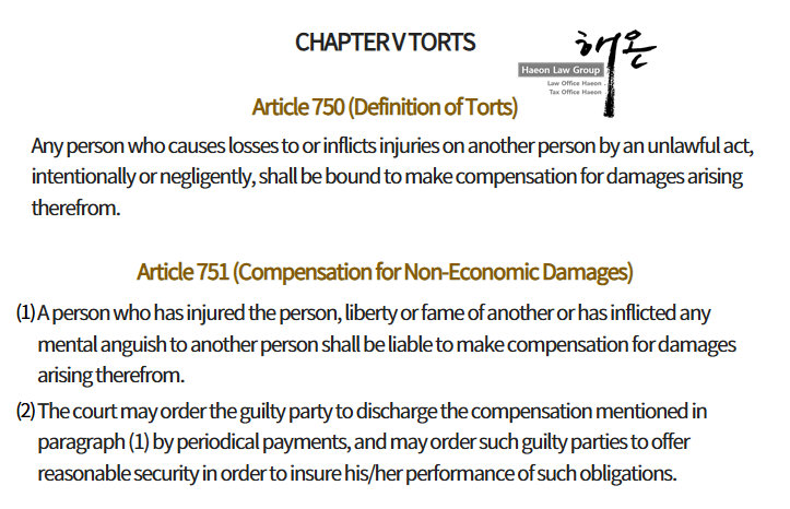 Article 751 of the Civil Act [Compensation for Non-Pecuniary Damage] explicitly states that a person who causes harm to another's body, liberty, or inflicts mental distress is liable for damages, including non-material losses.
