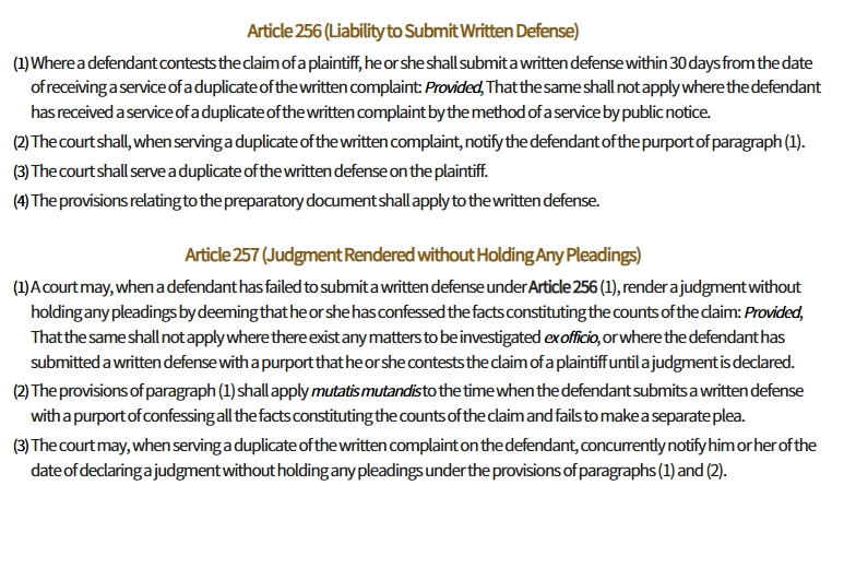 In Korea, adultery lawsuits are civil actions. According to Article 256 of the Civil Procedure Act, an answer must be submitted within 30 days from the date the complaint was served.
